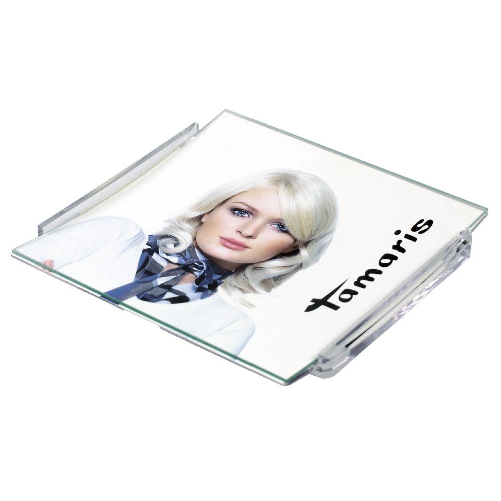 Le ramasse-monnaie verre-plastique PG3 est d'une forme carrée. Il consiste d'une base inférieure en plastique et d'une plaque supérieure faite du verre creusé antichoc. Les éléments se sont clampés et fixent l'étiquette publicitaire à l'intérieur du ramasse-monnaie. Le ramasse-monnaie est stable sur le comptoir grâce aux patins antidérapants sur la base.